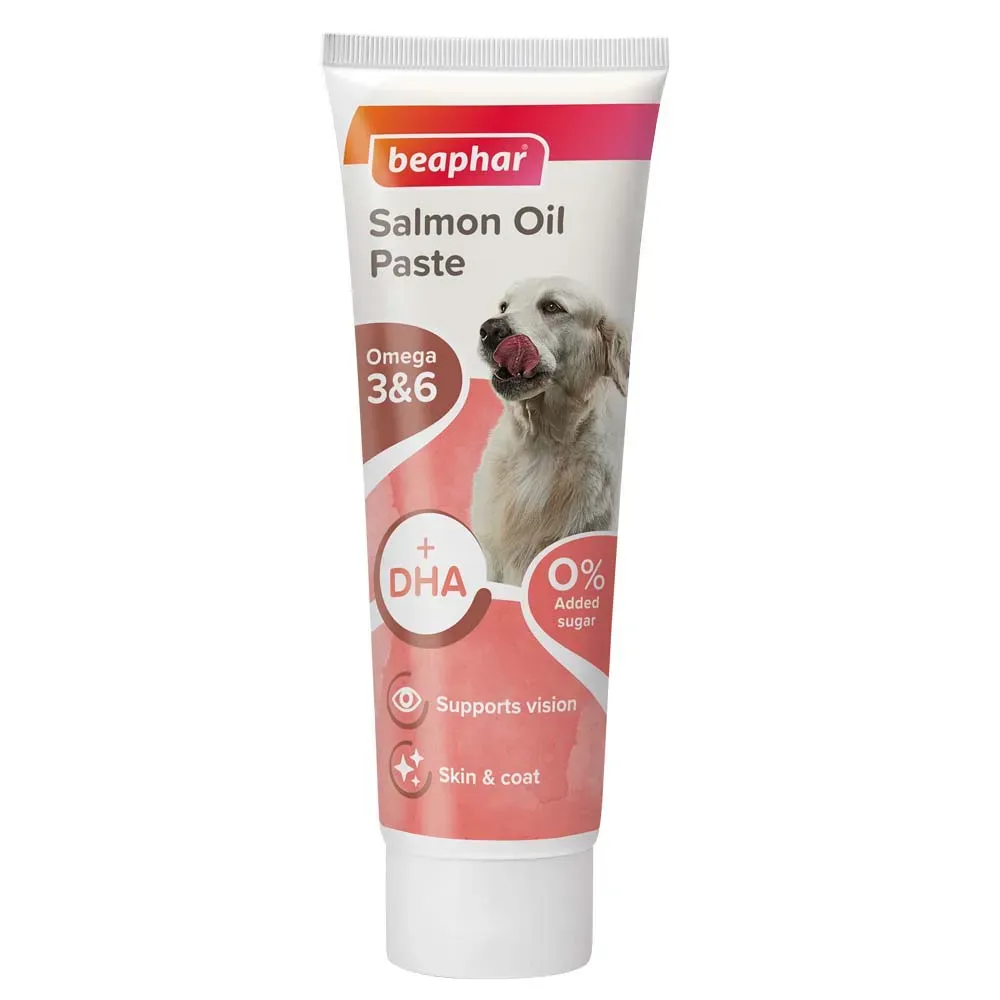 Beaphar Salmon Oil Paste for Dogs is a delectable treat enriched with Omega 3 and 6 fatty acids, designed to enhance your dog's coat, leaving it glossy and shiny. This nutritious paste also contains DHA, which plays a crucial role in supporting your dog's eyesight, ensuring they stay healthy and vibrant. Treat your furry friend to this tasty supplement that not only satisfies their taste buds but also contributes to their overall well-being.