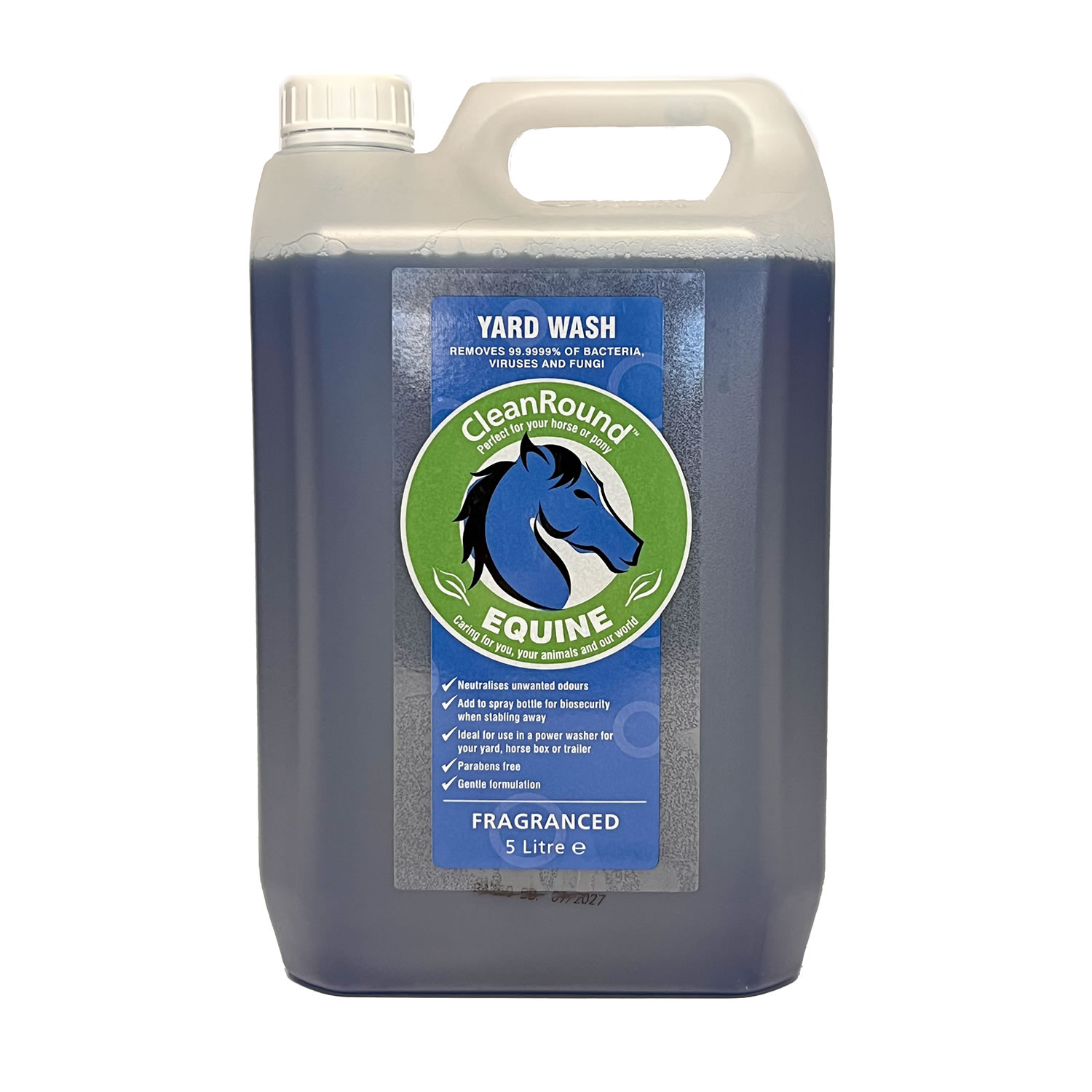 Antibacterial, antiviral and antifungal yard and stable wash. Combats odours, effective up to 1:20 dilution.CleanRound Yard Wash removes 99.9999% of bacteria, viruses and fungi, and has been designed and formulated for use on any hard or soft surfaces, (metal, wood, plastic, rubber, concrete etc). It is ideal for more specific areas where cleaning control is important, such as post op and foaling boxes. The patented formulation in CleanRound is effective against the bacterium streptococcus equi, and a broad-spectrum of other bacteria, viruses and fungi.