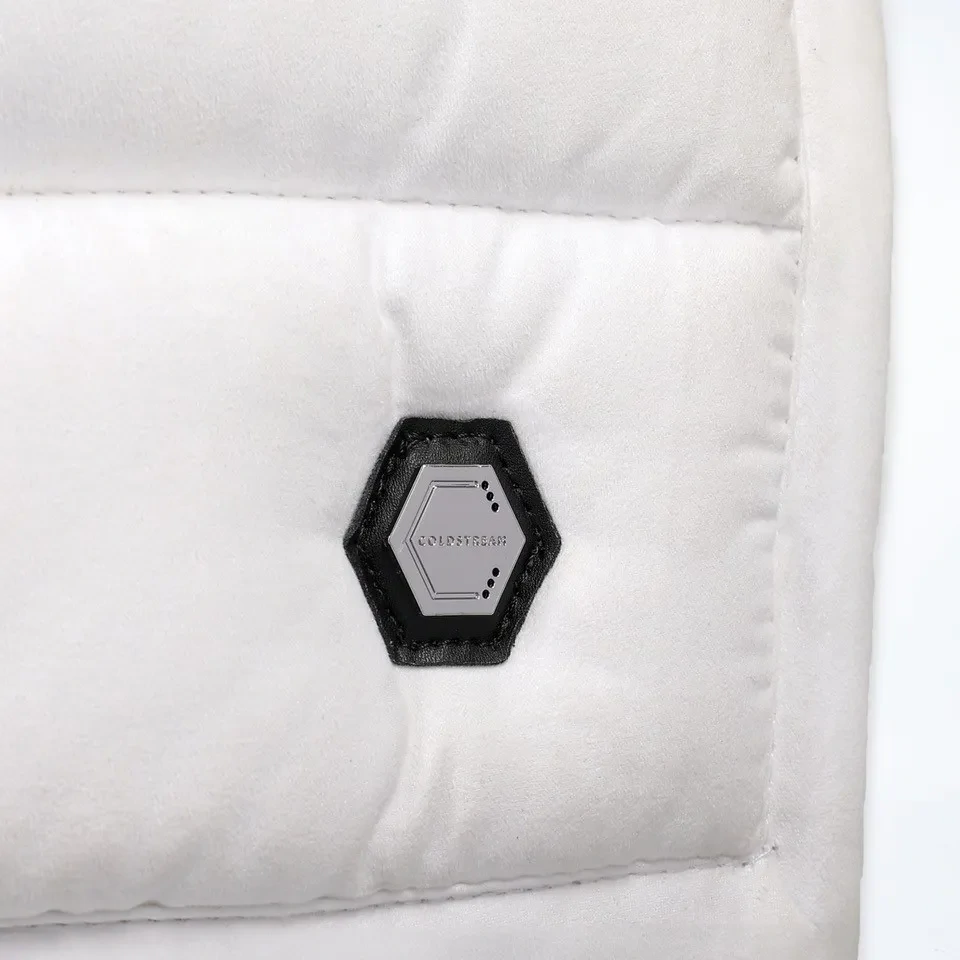 The Coldstream Belford Suede Saddle Pad features the very latest in innovative materials. The exterior designed using a tactile suede that not only looks and feels good but is incredibly impervious, making this an ideal saddle pad for long-lasting style and durability. Lined with a CoolMax fabric that assures optimal moisture management, ideal for when your horse is working hard to control sweat dispersion. The thick technical filling ensures that the pad will aid with shock absorption of the back and shoulders and helps create an even pressure distribution, which assists with alleviating pressure points under the saddle for optimum comfort for your horse. The technical fabrics and filling are fully breathable and lightweight.The contemporary CS-grip system features along the top of the pad to helping to reduce unwanted movement and slipping. This is turn reduces friction, thus improving comfort and reducing heat build-up. Finished with a luxury silver metal Coldstream badge with leather backing, subtle tonal stitching and practical girth loop for additional security.