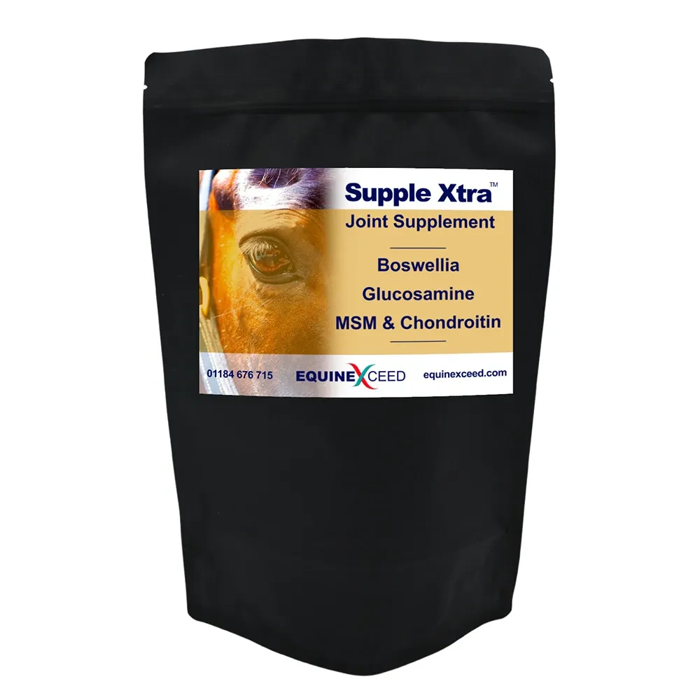 Elevate your horse's joint health with Equine Exceed Supple Xtra, a highly palatable daily supplement designed to support mobility and overall well-being. Formulated with a powerful blend of scientifically proven ingredients, including Glucosamine, Chondroitin, MSM, and Boswellia, this supplement promotes healthy connective tissue, cartilage, and bones while delivering natural anti-inflammatory benefits. Ensure your equine companion stays active and comfortable with Supple Xtra, the ideal choice for maintaining optimal joint function.