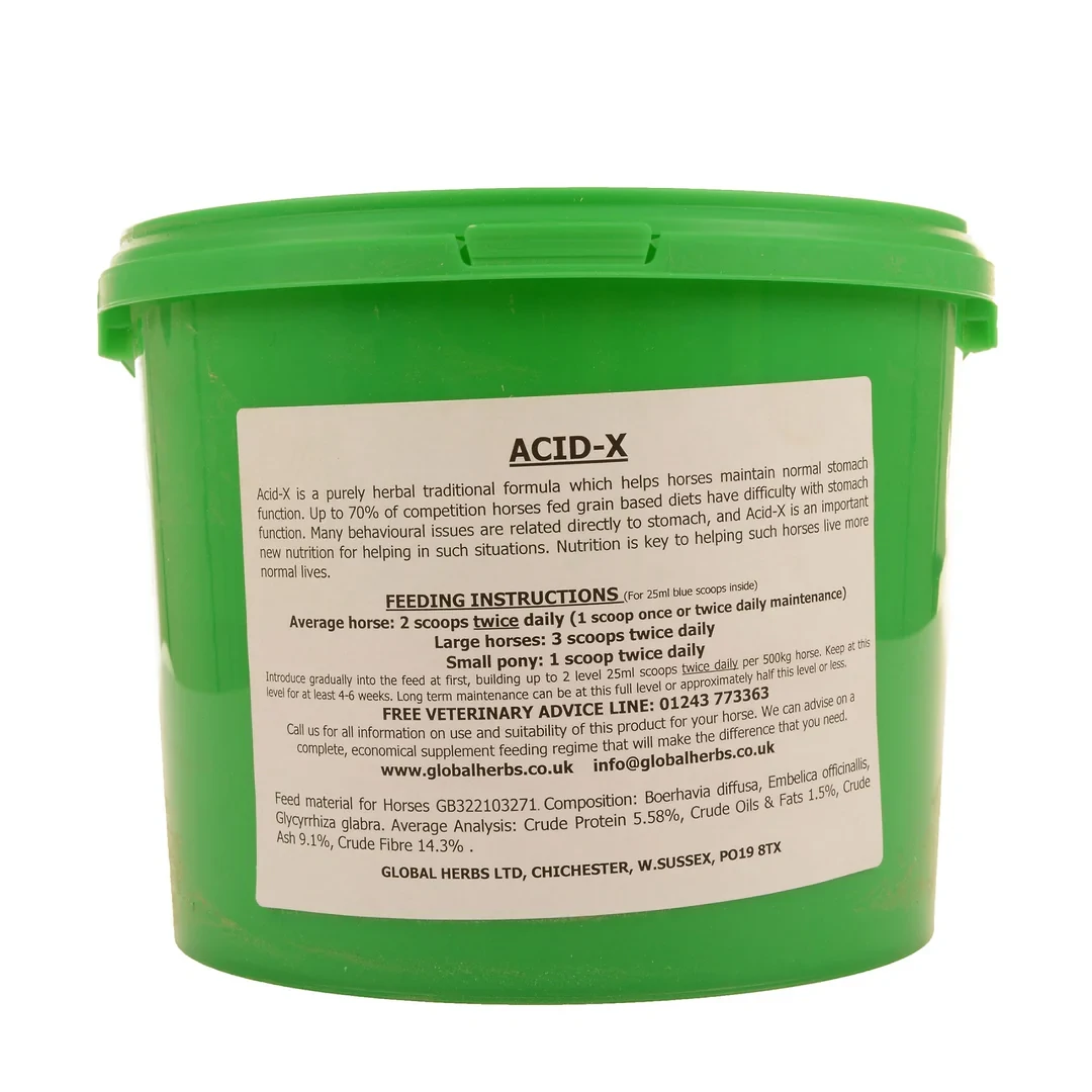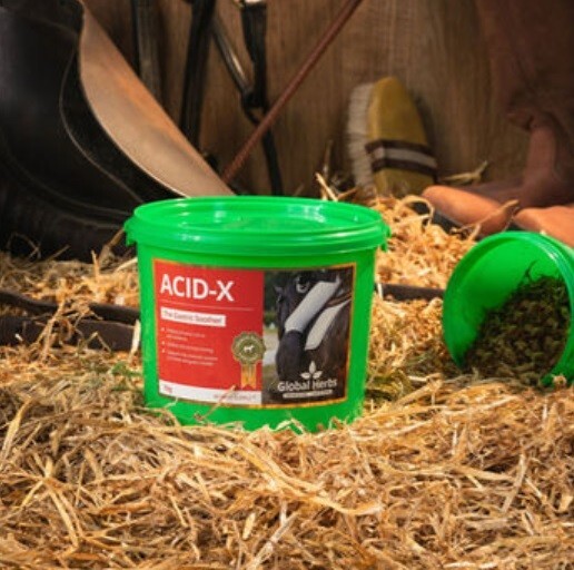 Global Herbs Acid-X is a traditional herbal stomach soother. Acid-X supports normal acid levels in the horse's stomach and aids digestion. Acid-X helps to maintain a stable stomach lining and assists with food utilisation which allows horses to take in food more comfortably and safely.
