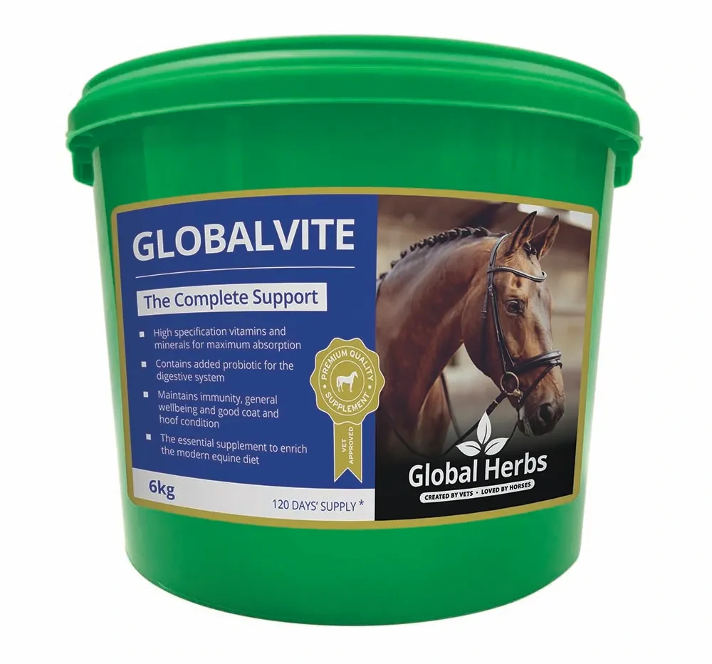 Elevate your horse's health with Global Herbs GlobalVite, a premium supplement rich in unique chelated minerals that ensure optimal absorption for your equine companion. Each serving is fortified with essential vitamins, designed to support overall bodily functions, maintain peak condition, and enhance immune system stability. With benefits that extend to healthy joints, skin, and hooves, GlobalVite is the perfect addition to your horse's daily regimen for comprehensive wellness.