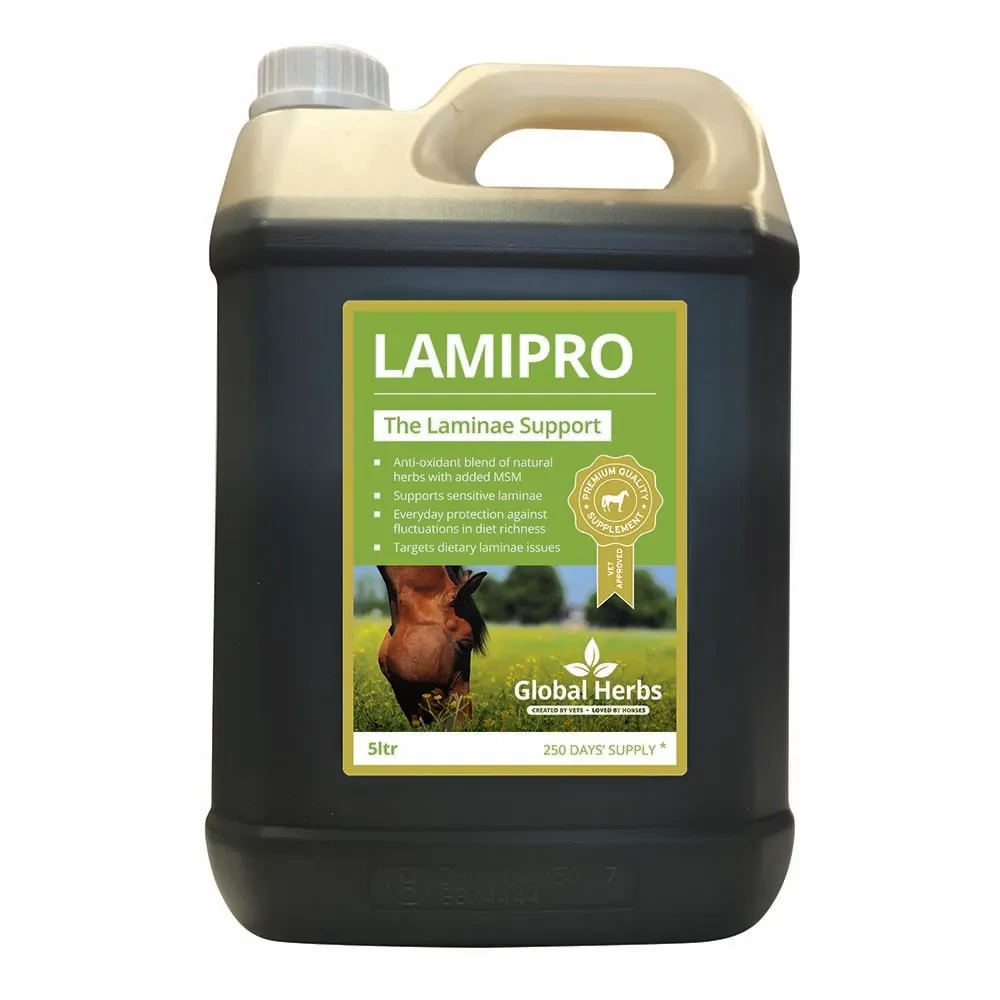 LamiPro Liquid is an advanced, fast acting and unique nutritional approach for horses’ sensitive laminae. LamiPro Liquid soothes horse’s laminae at any time and is particularly useful when there is a flush of spring grass. This palatable herbal supplement works by providing nutritional support for digestion, metabolism, liver function and feed utilisation. This combined action supports and comforts the feet at any time throughout the year. The formula is very quick acting and starts to give nutritional support from the first day fed.