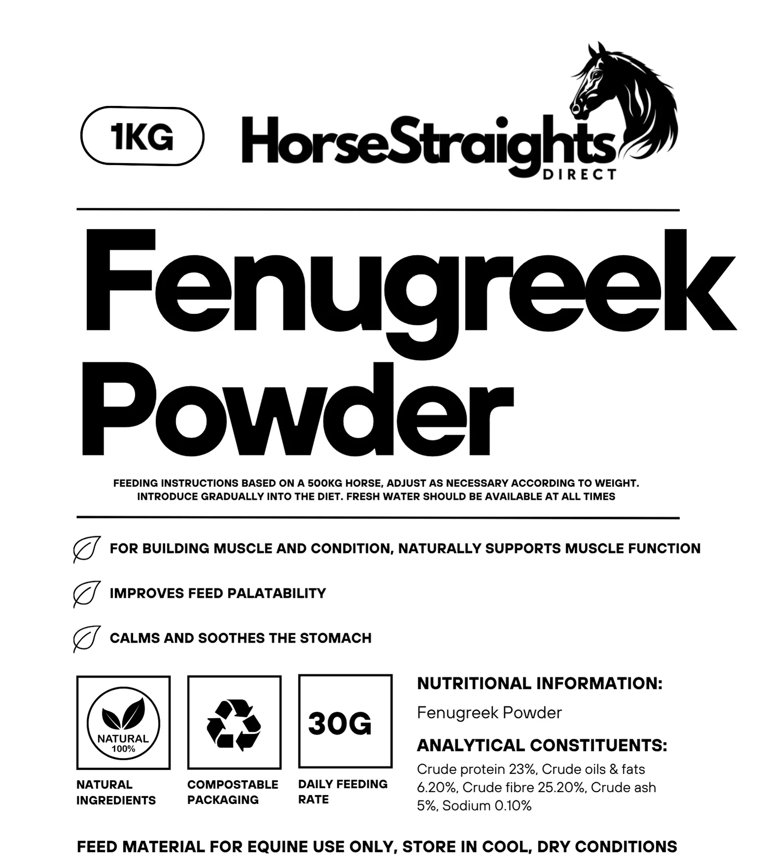 Fenugreek Powder For Horses 100% Natural Horse Supplement. Premium Quality Horse Herbs Equine Supplements in 100% Compostable Packaging Horse Straights Direct Fenugreek Powder - Tested for Equine Use Only
