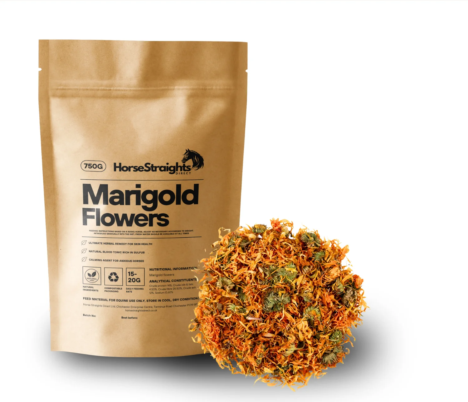 Marigold Flowers For Horses 100% Natural Horse Supplement. Premium Quality Horse Herbs Equine Supplements in 100% Compostable Packaging Horse Straights Direct Marigold Flowers - Tested for Equine Use Only