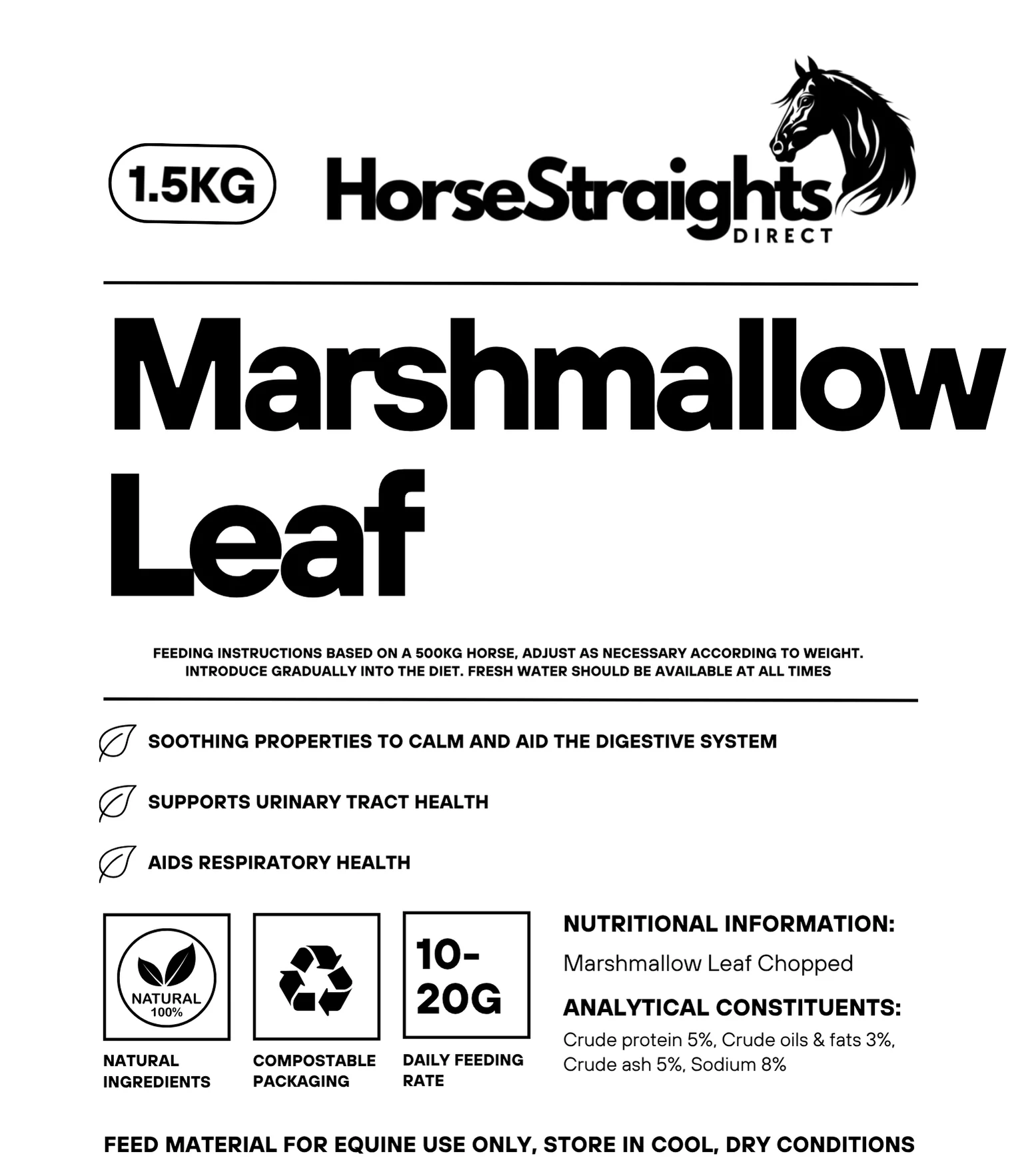 Feeding rate (based on an average 500kg horse): 10-20g per day