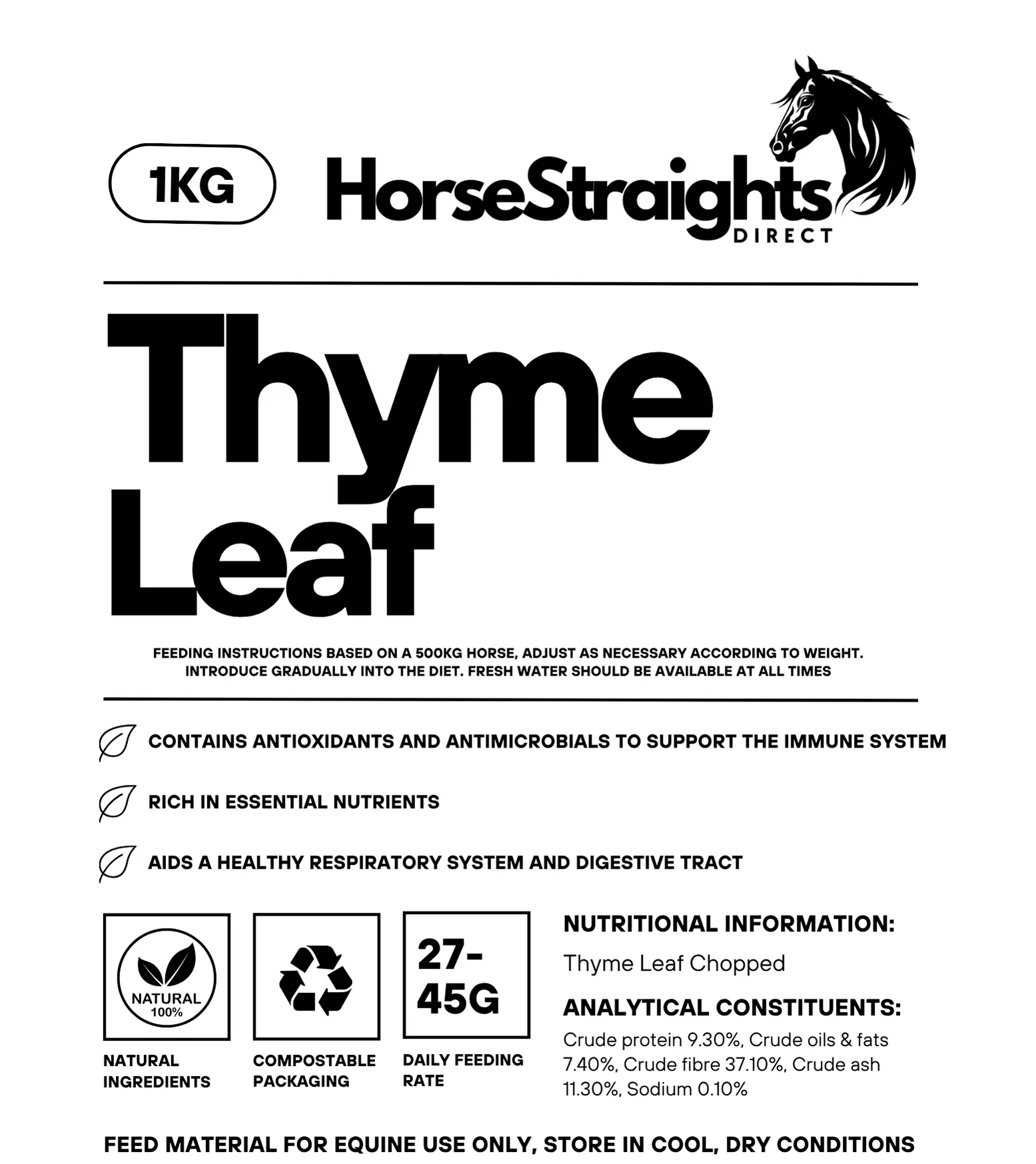 Thyme Leaf Chopped For Horses 100% Natural Horse Supplement. Premium Quality Horse Herbs Equine Supplements in 100% Compostable Packaging Horse Straights Direct Thyme Leaf Chopped - Tested for Equine Use Only