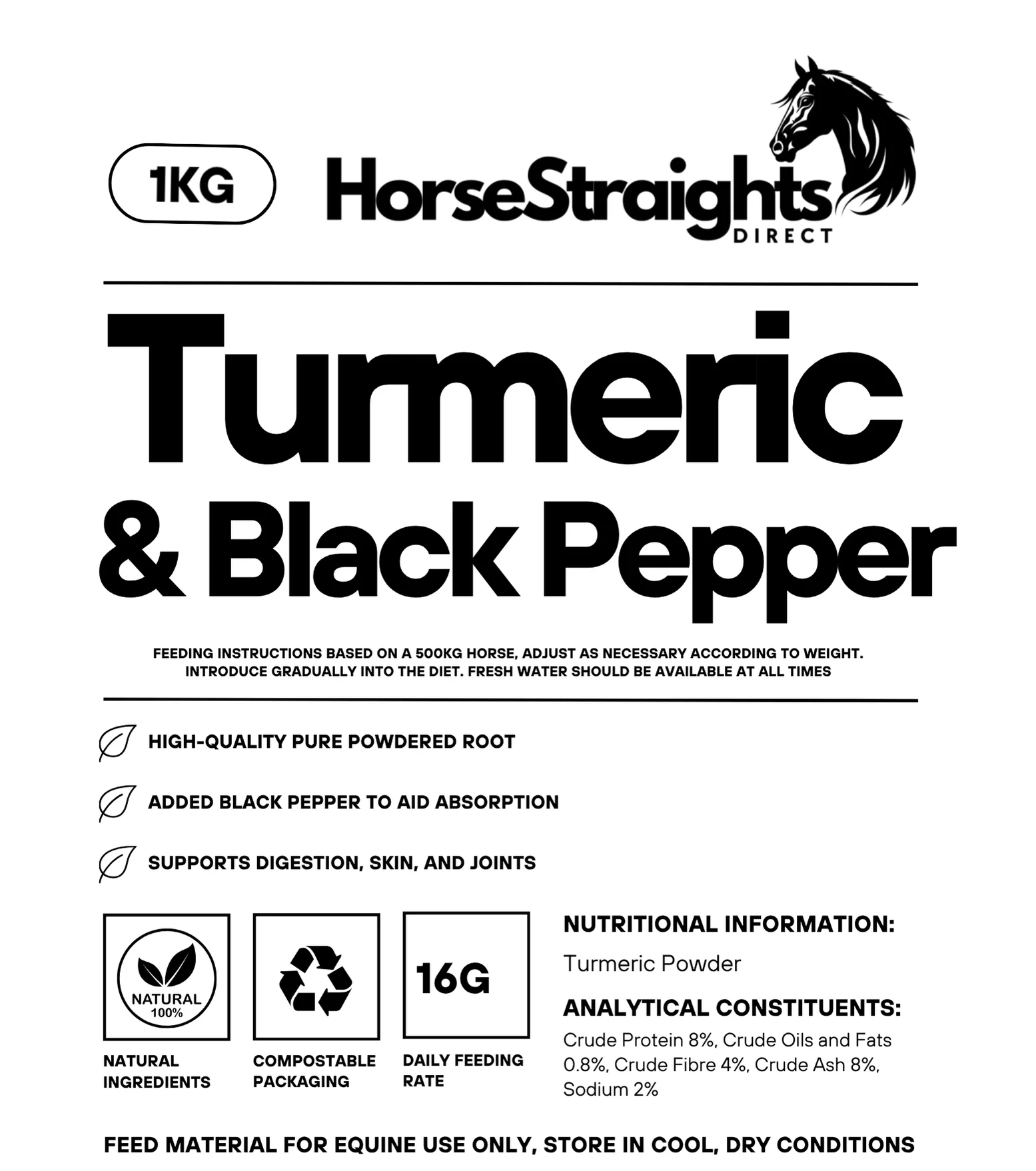 Turmeric with Black Pepper For Horses 100% Natural Horse Supplement. Premium Quality Horse Herbs Equine Supplements in 100% Compostable Packaging Horse Straights Direct Turmeric with Black Pepper - Tested for Equine Use Only
