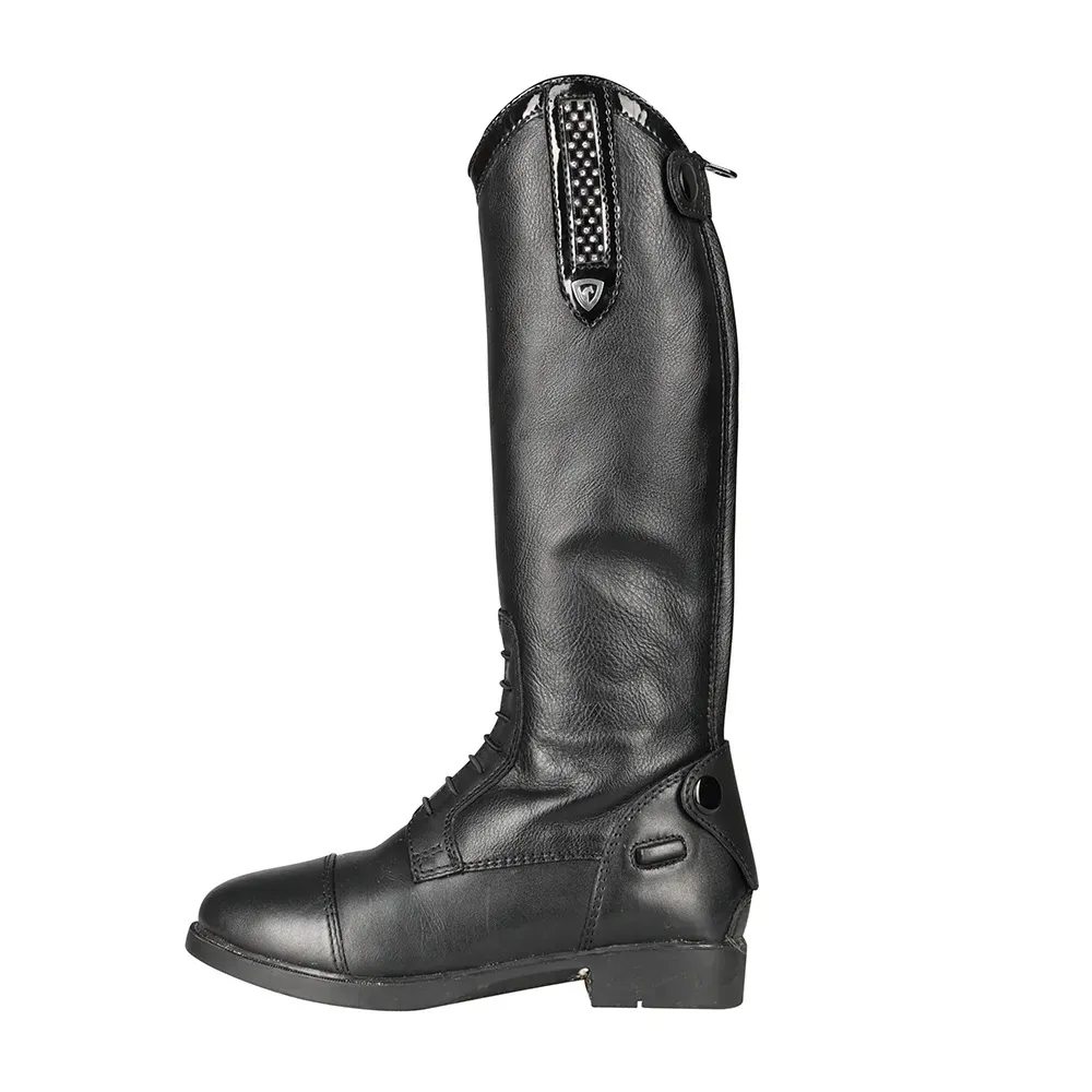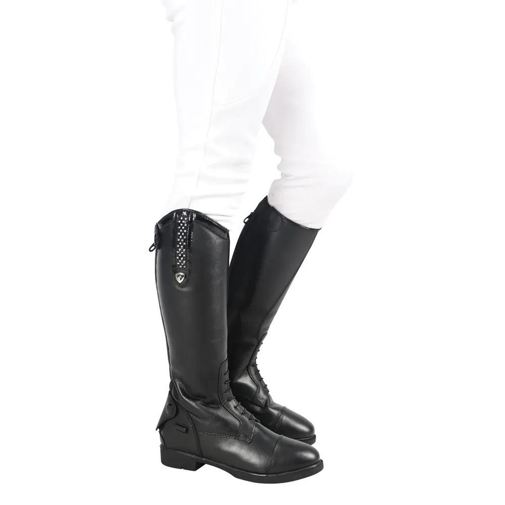 Add a touch of sparkle to your riding outfit with the all new Arnara Riding Boot - a traditional field boot look with a stylish shimmer twist. Featuring lace fronts for the classic finish, but with the addition of a black glitter strip at the top of the boot finished with a delicate row of diamantes and embossed metal logo pin. With elasticated back panel for superior comfort, ease of fastening and close contact feel and sturdy zip fastening with secure top press stud closure. Including spur rests to the heel, spur guard at the bottom of the boot and durable anti-skid sole for stability. The perfect addition to your boot collection, whether to wear every day or save for best.