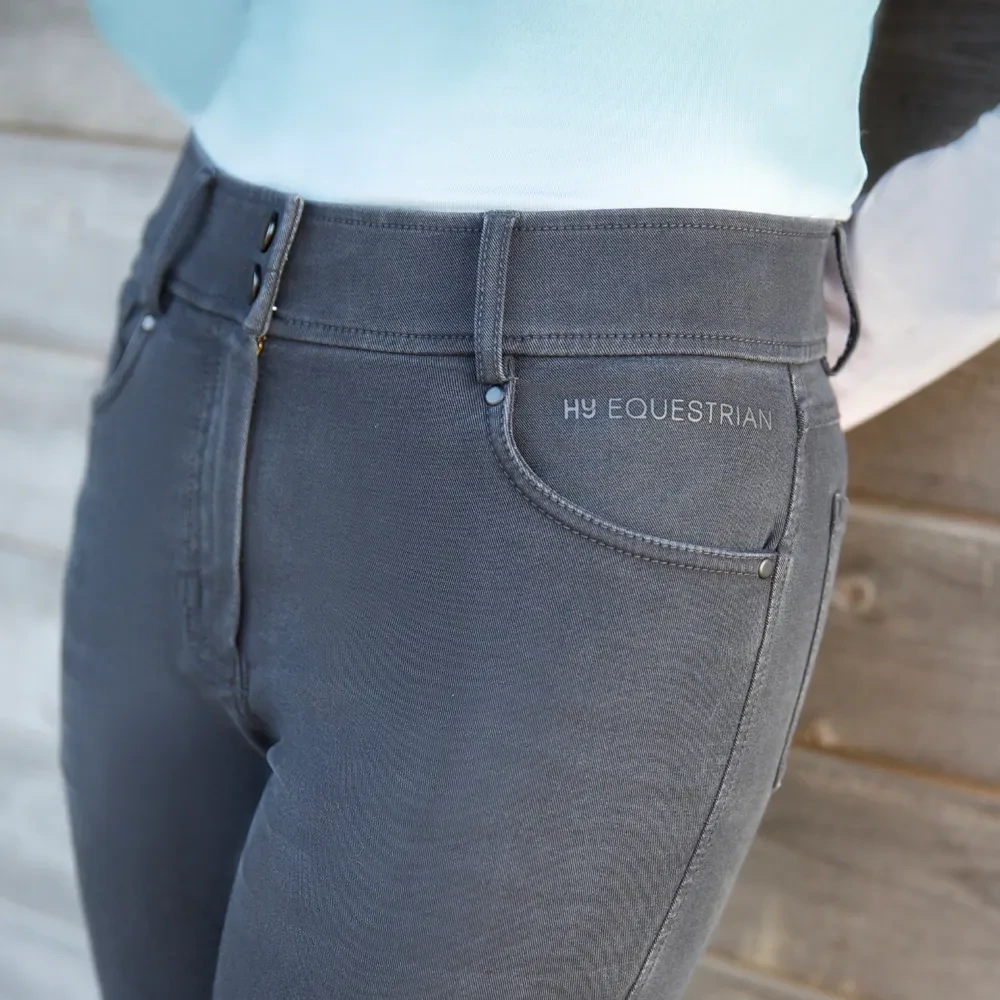 Create a relaxed and stylish look with the Elevate Denim Breeches. Made from a soft denim stretch fabric, these breeches move with every movement and will sit perfectly for a flattering shape. With front and rear pockets for practicality and tapered lower leg for a contoured fit. The full silicone seat increases grip when in the saddle, whilst the tonal finish allows for these to be worn for more casual events. Fastened with durable Hy Equestrian gutos on a secure waistband with belt loops - accessorise your look with a belt to complete the look.