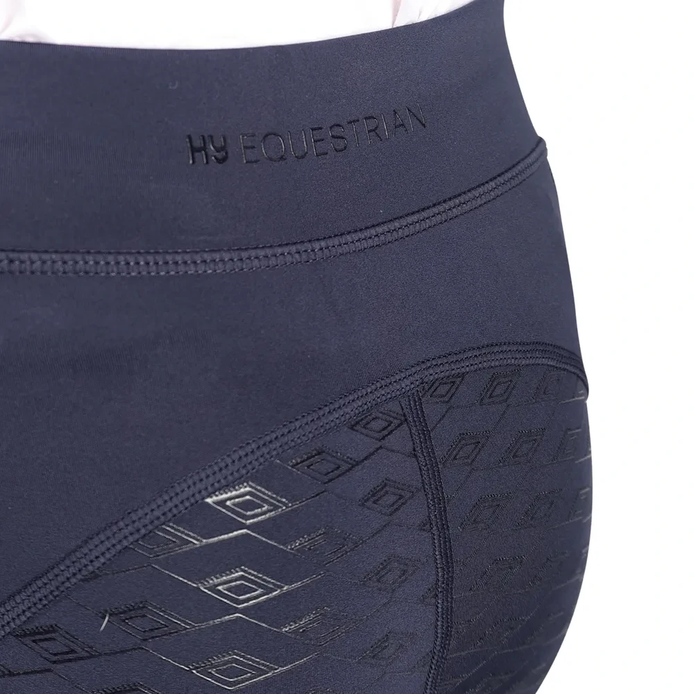These superb riding tights offer an excellent fit, comfort and performance thanks to the four-way stretch fabric. Stability and grip in the saddle is aided by the full matte silicone seat in an attractive diamond pattern. The high waistband features a wrap over design at the front for a flattering fit, with Hy Equestrian detailing to the back of the waistband. Both the practical phone pocket and non bulk ankles feature a stylish mesh overlay for a fashionable finish..
