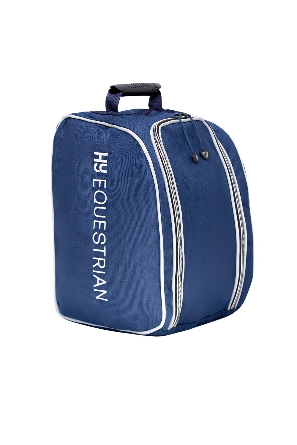 Keep your riding hat in pristine condition with the navy Hy Equestrian Helmet Bag. Designed for durability and convenience, this bag features a secure duo zip fastening and a soft inner lining to protect your helmet from dust and scratches. Its hard-wearing feet ensure stability, while the side pocket offers extra storage for small essentials. With a name and address holder for easy identification and a sturdy carry handle for effortless transport, this stylish bag, adorned with the Hy Equestrian logo, is an essential addition to your riding kit.