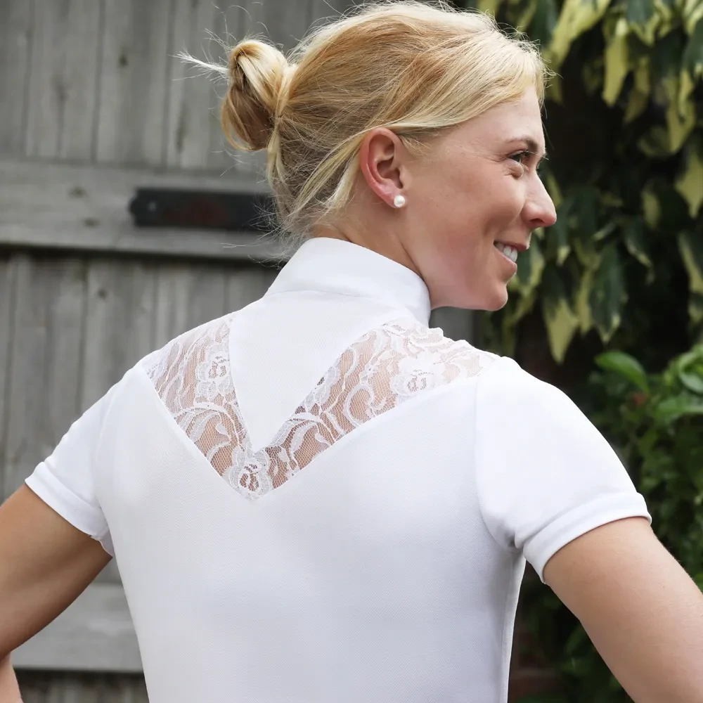 elegant short sleeve show shirt, featuring exquisite cut-out lace detailing along the shoulders. Crafted from a high-performance technical fabric, this shirt offers unparalleled comfort, flexibility, and breathability, making it the ideal choice for any competition. The stylish silver zip and front stitching are designed to accentuate your waistline, creating a flattering silhouette that enhances your confidence in the ring. Finished with the signature Hy Equestrian logo on the hem, this shirt seamlessly combines practicality with sophistication, ensuring you look and feel your best while riding.