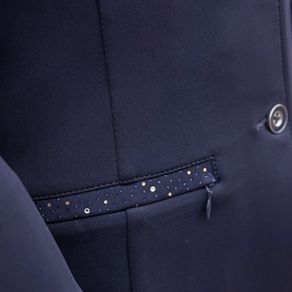 A smart jacket that gives ultimate comfort and style; something that everybody wants to have whilst competing. The diamante detailing creates an eye-catching look for when you are in the arena, giving off a subtle sparkle when they catch the light. Designed with four-way stretch material this jacket enhances flexibility and shape retention whilst riding along with having water repellent and moisture wicking properties for benefit in wet conditions. Fastened with colour coordinated buttons for a smart finish.