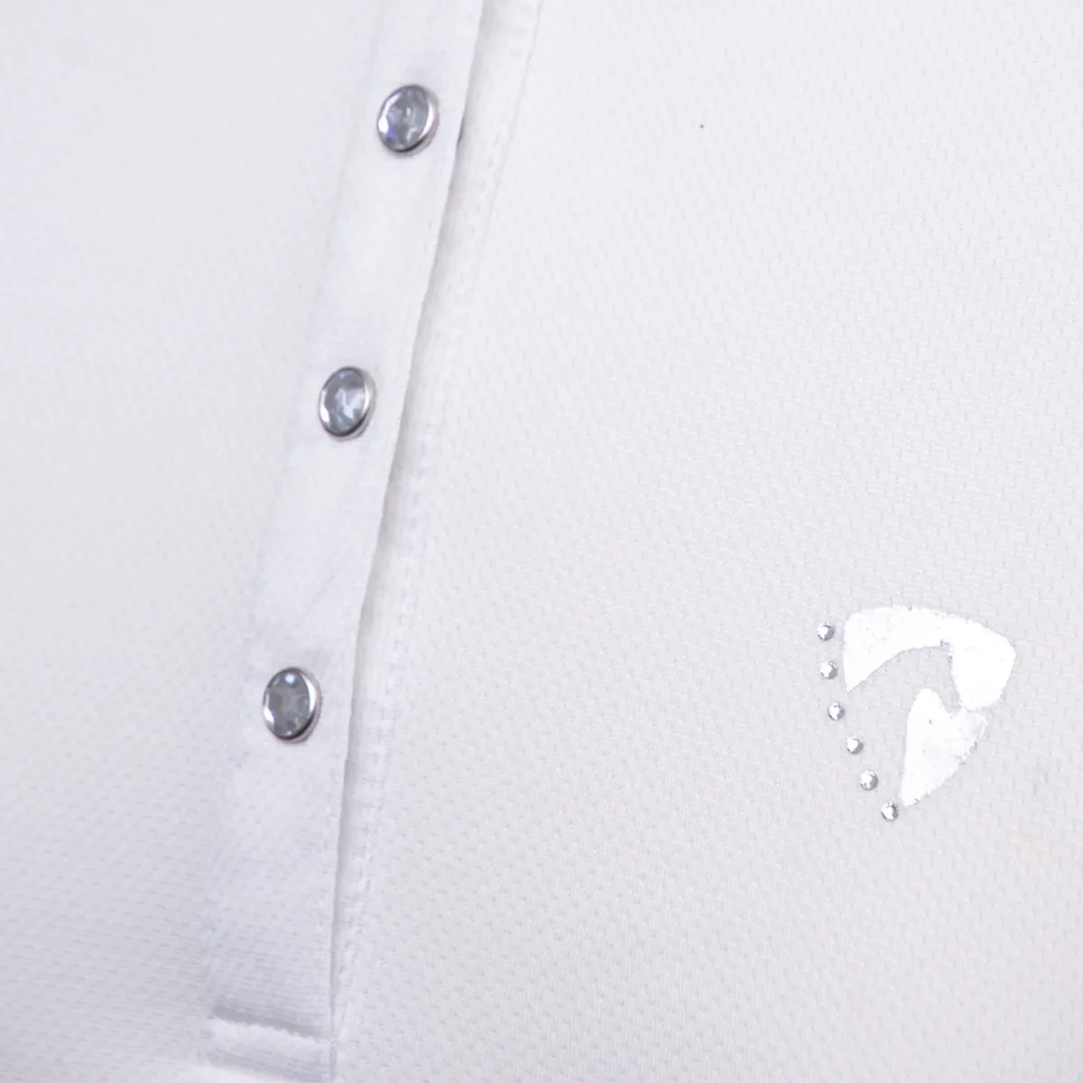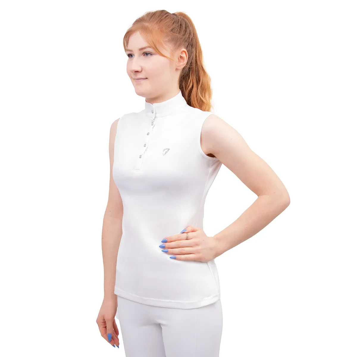 Hy Equestrian Sophia Sleeveless Show Shirt, a perfect blend of sophistication and performance. Featuring five stunning crystal press studs on the neck placket and elegant silk trim detailing in a contrasting white, this shirt is designed to impress. Crafted from advanced Dri-tex fabric, it ensures breathability and moisture-wicking properties for a quick-drying, comfortable fit during competitions. The embroidered silver Hy logo on the chest adds a touch of refinement, making this show shirt an essential addition to your riding attire.