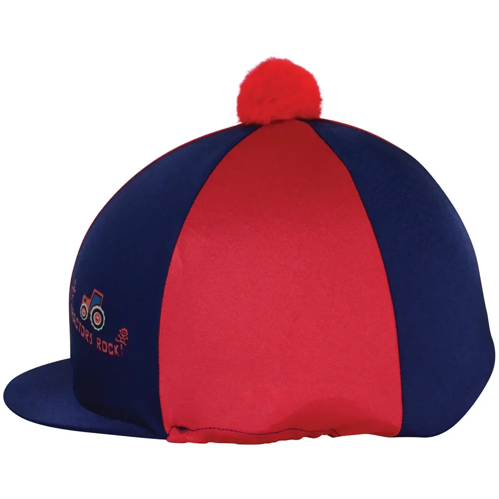 Add a bit of fun to your riding outfit! Featuring the ‘Tractors Rock’ emblem, this hat cover is certainly eye catching with its alternating red and navy panels and matching pom pom. Including a stiffened peak, and made from stretchy material this hat cover will stay securely in place and fit all hat sizes. Complete the look with other items from the ‘Tractors Rock’ collection!