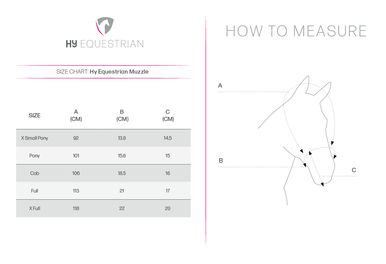 This nylon muzzle helps to regulate the grazing of horses. Featuring a rubber base, velcro closure headpiece and clip throat lash for easy fitting and secure positioning, it comes in five sizes: X-Small Pony (5" muzzle depth, 18" muzzle circumference, 35" headpiece), Pony (5" muzzle depth, 20.5" muzzle circumference, 39" headpiece), Cob (6.5" muzzle depth, 24" muzzle circumference, 42" headpiece), Full (6.5" muzzle depth, 26" muzzle circumference, 45" headpiece) and X-Full (7.5" muzzle depth, 28" muzzle circumference, 45" headpiece).