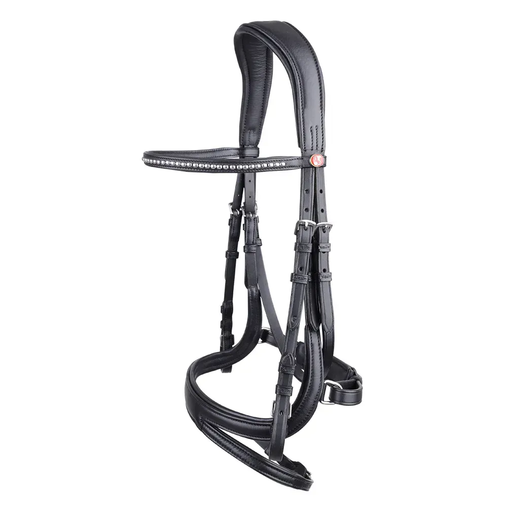 This snaffle bridle is another innovative addition to our Kieffer Ultrasoft Family. With the Tara the flash strap is integrated into the curved noseband. This helps to relieve pressure on the sensitive nasal bone and keeps the noseband in the correct position. The noseband curves up into the cheek piece, relieving the cheek bone and providing more space for the bit ring. Made of extremely soft leather with a soft padded anatomically shaped crownpiece. A cut-back design for more ear comfort and a fineline browband (not lined) with silver-coloured metal beads. The noseband can be buckled on both sides with chrome buckles and web reins.