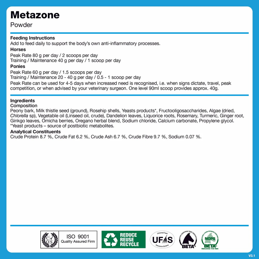 Five Star Metazone is compliant with FEI rules and does not require a withdrawal time for national bodies. It is simple and easy to feed, available in a daily powder or liquid to add into existing feeds. Five Star Metazone is safe to be fed alongside supplement offerings such as joint nourishment, with the option of using a fast acting syringe when required or to use as a top up.
