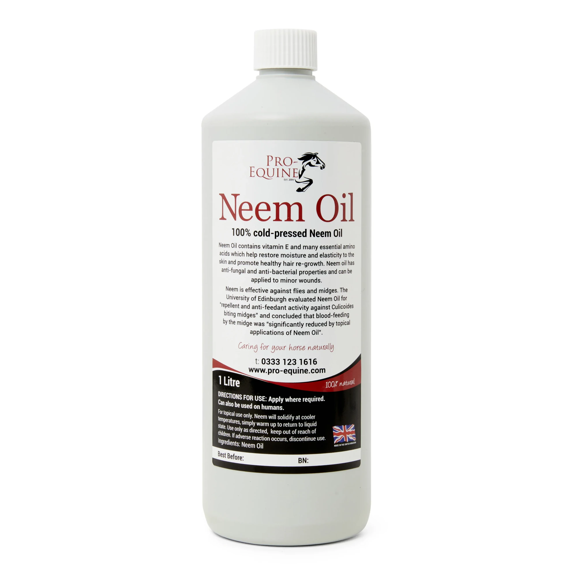 Neem Oil is one of nature’s marvels. It is antibacterial and anti-fungal and contains vitamin E and many essential amino acids, which help moisturise and soothe the skin. Neem Oil’s collagen properties promote healthy, new skin, reduce scar tissue and encourage rapid hair re-growth. It is ideal for horses bothered by flies and midges and who rub and scratch away parts of their mane, tail and even coat. Pro-Equine's Neem Oil is cold-pressed and very high quality, with a high Azadirachtin content ensuring it is effective for a multitude of uses. It can be applied neat or diluted, to keep insects away in the first instance and to avoid your horse being bitten. If your horse has been bitten and is itchy, Neem helps stop further biting, deeply moisturises and soothes the skin, and encourages rapid hair re-growth. Neem’s properties have been scientifically tested by the University of Edinburgh which concluded that blood-feeding by the midge was “significantly reduced by topical applications of Neem oil".