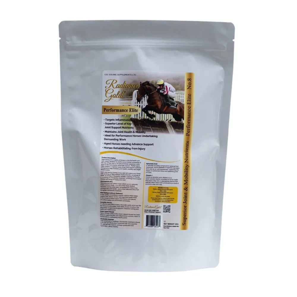Performance Elite by Radiance Gold is a high-specification joint supplement engineered to support your equine's joint health at the highest level. Its superior blend of key joint-supporting nutrients helps target inflammation, promote mobility, and maintain overall joint integrity—making it the ideal choice for performance horses and ponies engaged in demanding work, aged horses and ponies requiring advanced support, and those rehabilitating from injury.
