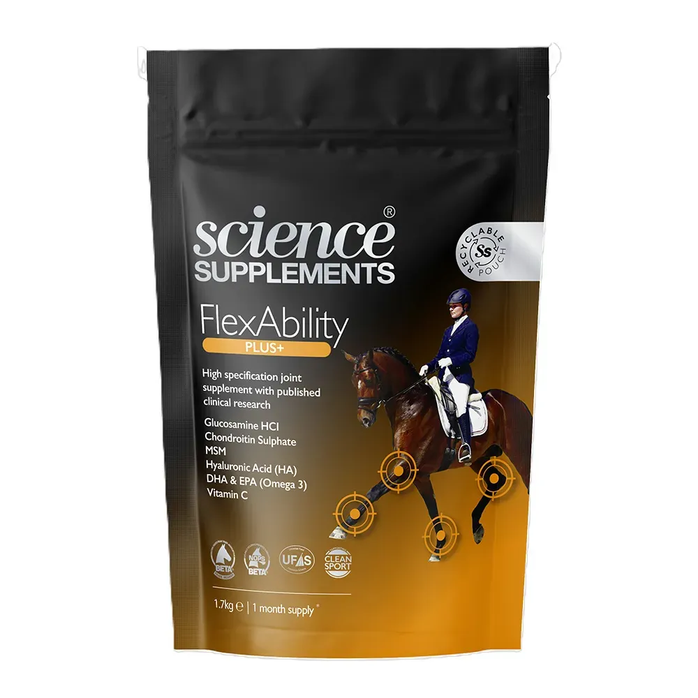 The highest specification joint supplement available in the UK and the only joint supplement on the market with two clinical and scientific studies demonstrating the positive effects of joint supplementation. Formulated for maximum effect with superior levels of active ingredients and scientifically evaluated. A high specification supplement that provides declared levels of key nutrients involved in cartilage synthesis and support using a unique combination and optimal levels of scientifically proven ingredients including glucosamine, low molecular weight chondroitin, MSM, omega 3 fatty acids DHA and EPA, hyaluronic acid (HA) and vitamin C. Low dust, highly palatable and tested for prohibited substances under the UFAS BETA NOPS scheme. Helps to promote and maintain normal mobility and joint function, is suitable for all horses and ponies and provides nutrient support for joints against the rigours of training and competition. It can also help to maintain normal mobility and joint function in older animals.