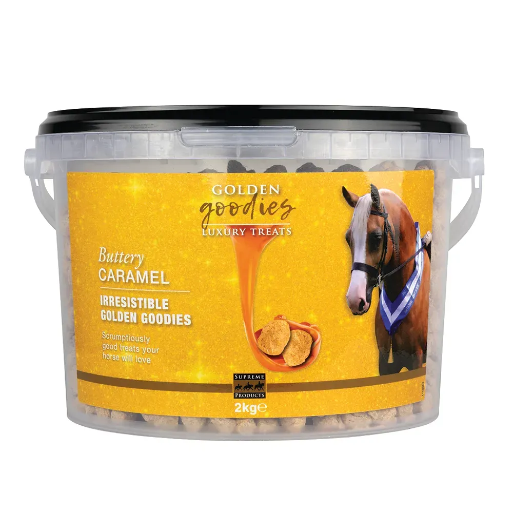 Introducing the new deliciously tasty and irresistible golden goodies horse treats from Supreme Products! These scrumptiously good buttery caramel flavoured treats are the perfect training reward for your horse, ideal for use at home or in the show ring. Packed in a resealable foil bag for extra freshness and flavour. They are sure to become your horse's favourite!
