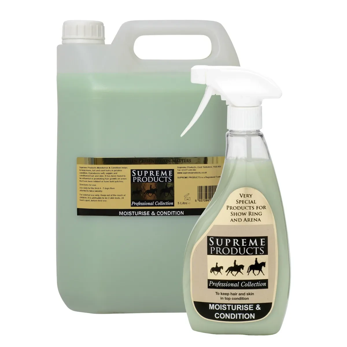 Supreme Products Moisturise & Condition is the ultimate solution for maintaining the health and beauty of your horse's mane and tail. Specifically designed for manes that are frequently plaited, hooded, or prone to dryness and damage, this nourishing spray provides essential moisture to keep the skin supple while conditioning and protecting the valuable hair. Regular use not only enhances the appearance of your horse's mane and tail but also helps preserve their integrity, ensuring they remain strong and vibrant. Elevate your grooming routine with this essential product for a lustrous finish.